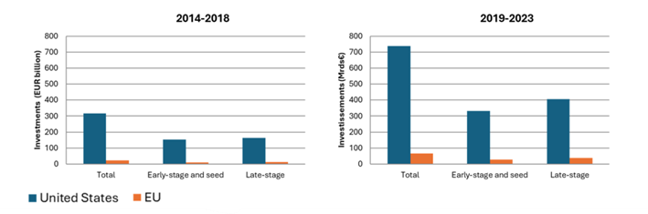 Entre 2014 e 2023, o investimento total em venture capital na União Europeia situou-se em cerca de 89 mil milhões de euros, comparando com mais de 1 bilião de euros nos Estados Unidos.